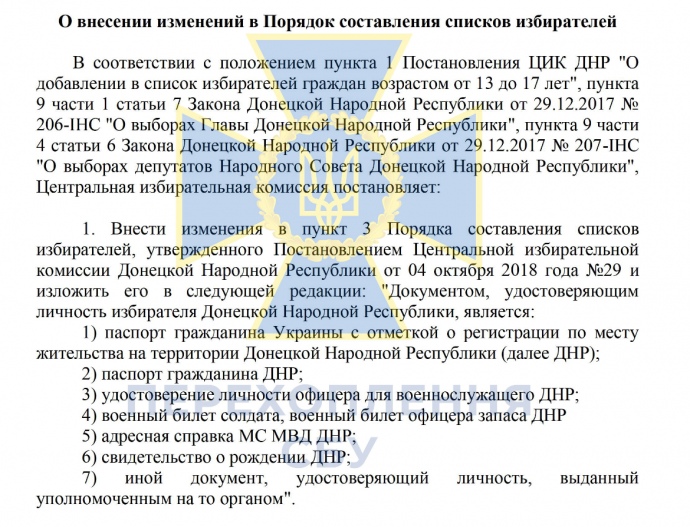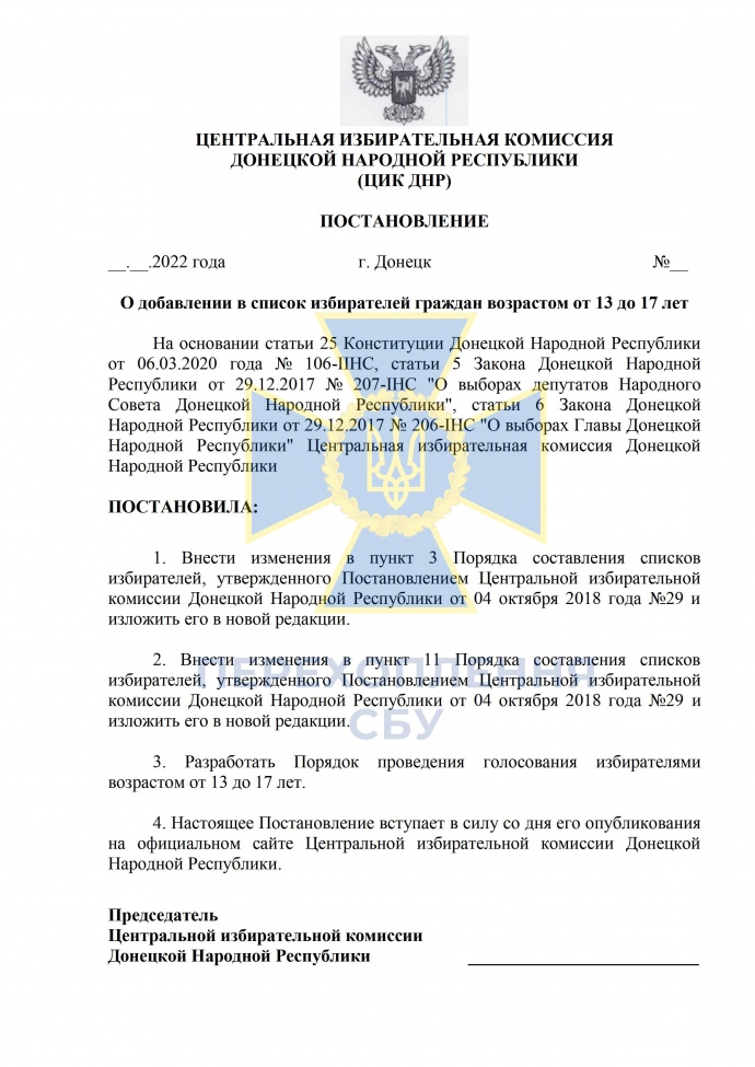 За інформацією СБУ, такий наказ так званій "центральній виборчій комісії ДНР" дали куратори з Росії. Українські спецслужбовці ідентифікували всіх організаторів, встановила їх місцезнаходження та задокументувала злочини.