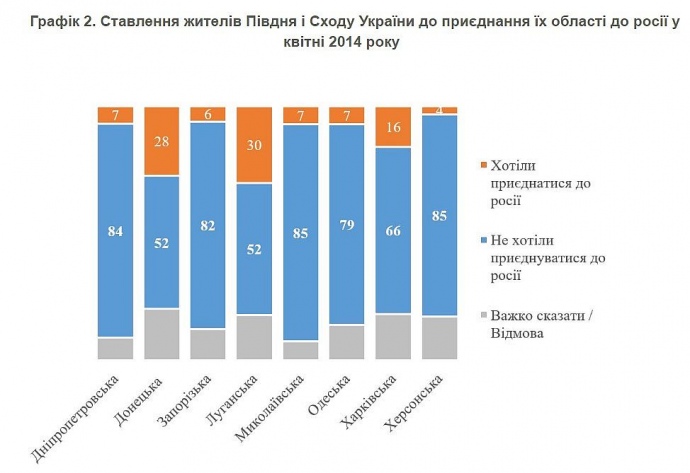 На пряме запитання про бажання від’єднатися і приєднатися до Росії ("Ви підтримуєте чи не підтримуєте думку, що вашій області слід відокремитися від України та приєднатися до Росії?") у Донецькій області 52% були проти приєднання до РФ, а підтримували – 28%. У Луганській області також 52% були проти приєднання до РФ, хотіли приєднатися – 30%.