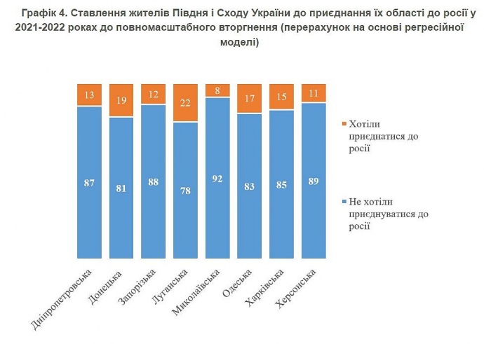 На основі цієї моделі навіть на Донеччині та Луганщині приєднання областей до Росії хотіли б лише 19 і 22% мешканців відповідно.