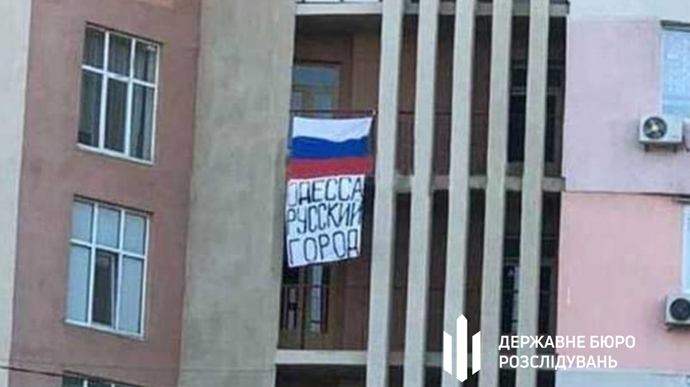 Дослівно бюро: "Встановлено, що від початку повномасштабного вторгнення Росії ці зрадники здійснювали активну підривну діяльність в місті. Зокрема, 22 серпня вони розмістили на одному з житлових будинків Одеси прапор РФ із підписом: "Одесса – русский город". Надалі це фото зрадники передали представникам держави-агресора для використання пропагандистськими ЗМІ, які цим виправдовували агресію проти України".