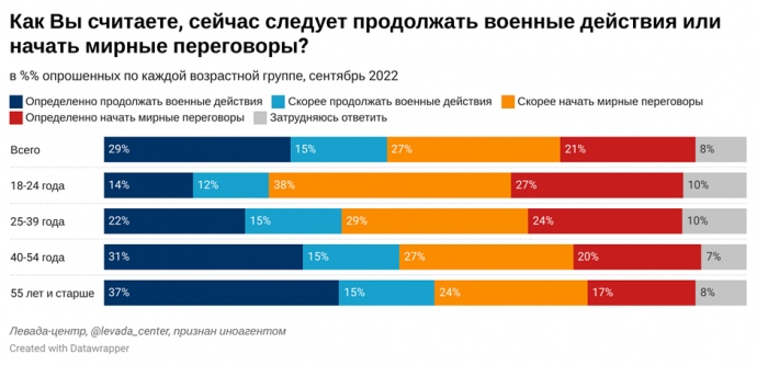 Довідка: Загальноросійське опитування Левада-центру проведено 22 - 28 вересня 2022 року за репрезентативною всеросійською вибіркою міського та сільського населення обсягом 1631 особа віком від 18 років і старше у 137 населених пунктах, 50 суб'єктах РФ. Дослідження проводять удома у респондента методом особистого інтерв'ю.