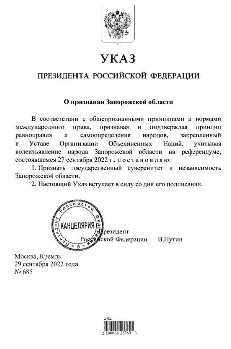 Деталі: Такий самий указ президента країни-агресора стосується і Запорізької області.