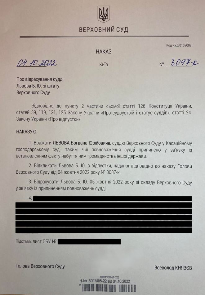 Дослівно: "Голова Верховного Суду Всеволод Князєв відрахував суддю Богдана Львова зі штату Верховного Суду".