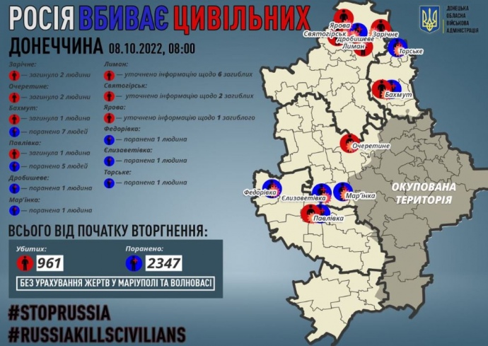 Голова Донецької ОВА Павло Кириленко повідомив, що за добу загарбники вбили 6 мирних жителів Донеччини: 2 - у Зарічному, 2 - в Очеретиному, 1 - у Бахмуті та 1 - у Павлівці.
