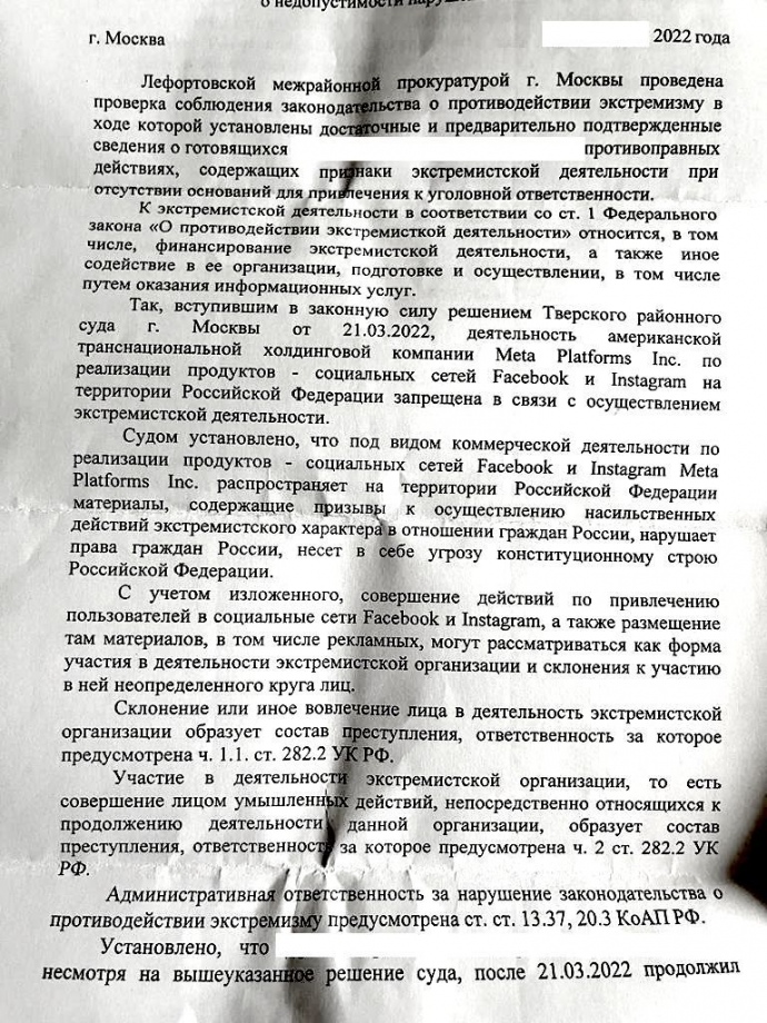 Деталі: Лефортівська міжрайонна прокуратура Москви вручила користувачу Facebook та Instagram застереження про неприпустимість порушення закону про протидію екстремізму