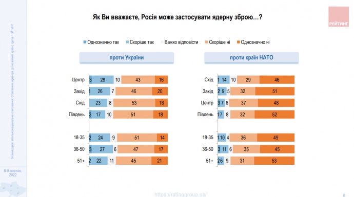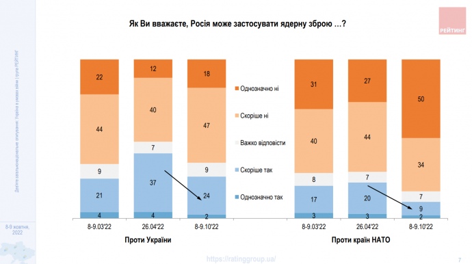 2% респондентів заявили, що Росія однозначно завдасть ядерного удару, 24% також вважали, що може піти на це. У можливість ядерного удару по країнах НАТО не вірять 84% опитаних.