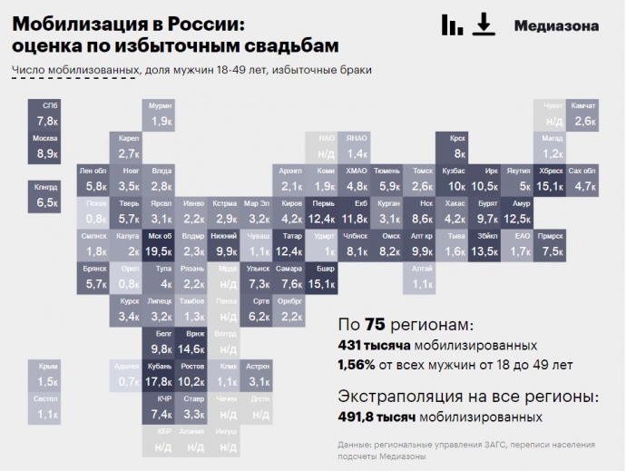 Журналісти вирахували відсоток мобілізації через співставлення 31 тисячі мобілізованих, які влаштували весілля, і 2 млн чоловіків, які згідно перепису 2021 року, живуть незареєстрованим шлюбним союзом, тобто неодружені офіційно. Цей показник склав 1,56%. Таким чином "випливає, що до середини жовтня в цих регіонах мобілізували щонайменше 431 000 осіб".
