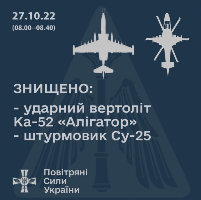 Зранку 27 жовтня Повітряні сили ЗСУ збили російський ударний вертоліт Ка-52 та штурмовик Су-25.