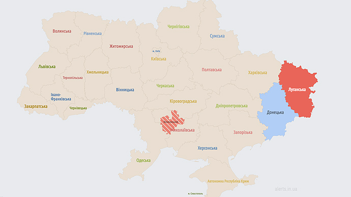 Станом на 13:29 тривога оголошена лише у Вознесенській територіальній громаді Миколаївської області.
