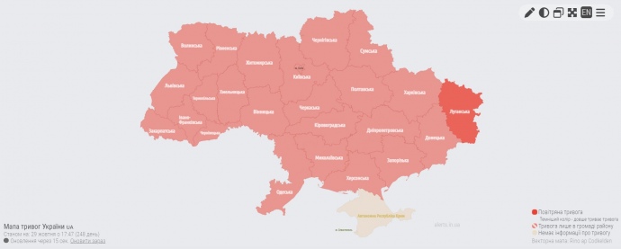 Деталі: Станом на 17:46 повітряну тривогу оголошено в усіх областях України, окрім окупованого Криму.