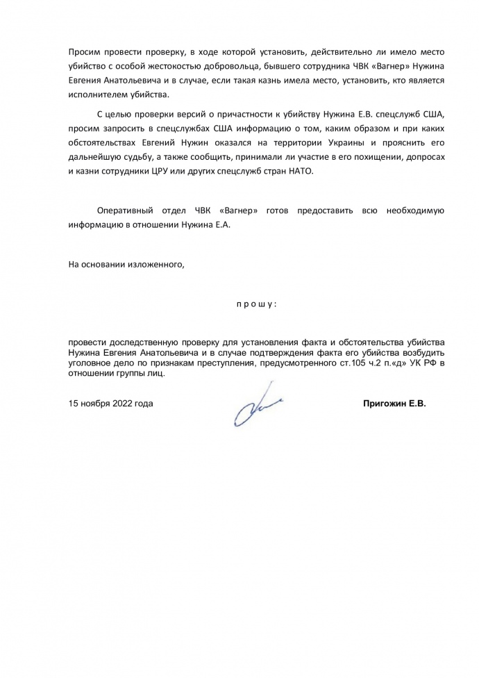 Оперативним центром ПВК "Вагнер" зараз розслідується версія про те, що Євген Нужин був завербований ЦРУ і завчасно сів у в'язницю на 27 років, у зв'язку з тим, що ЦРУ заздалегідь знало про майбутній (так званий - ред.) "держпереворот" в Україні в 2014 році, а також про можливі сутички на території України, він став членом ПВК "Вагнер" і створив умови для своєї страти".