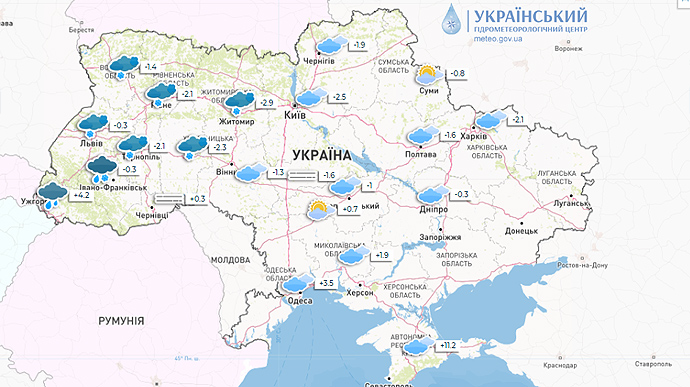 19 листопада в Україні очікується похолодання – вночі до -4°…-2°, вдень – до -1°, на півночі та заході – невеликий сніг, у Львівській, Івано-Франківській та Закарпатській областях – сніг з дощем. У центрі, на сході та півдні країни без опадів. В Одеській області вдень до +4°, у Криму до +12°.