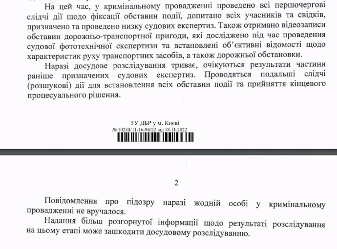 Надання більш розгорнутої інформації щодо результаті розслідування на цьому етапі може зашкодити досудовому розслідуванню".