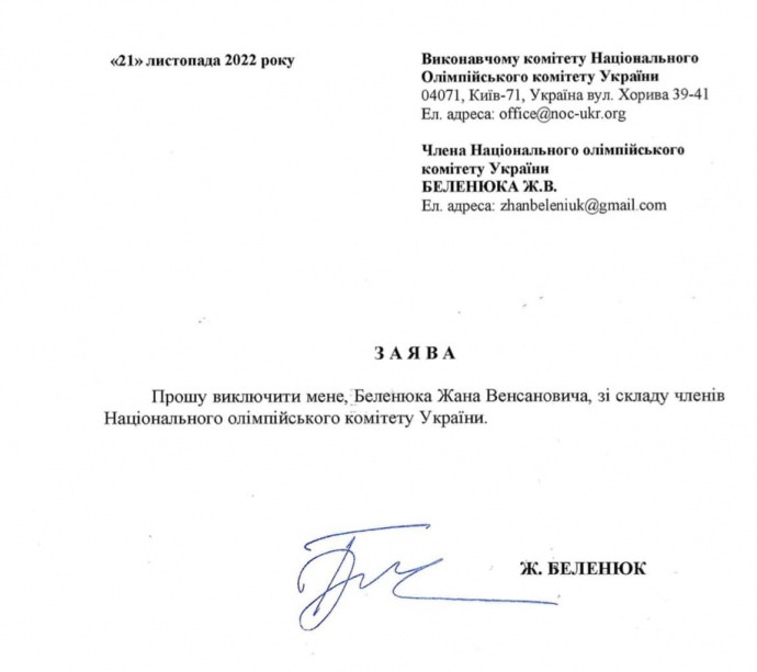 Борець греко-римського стилю й народний депутат Жан Беленюк просить виключити його із членів Національного олімпійського комітету України.