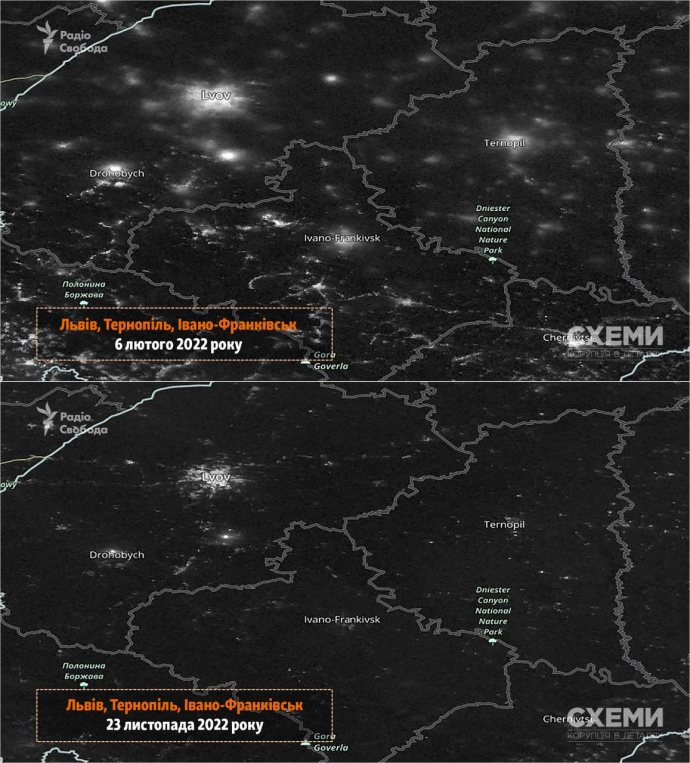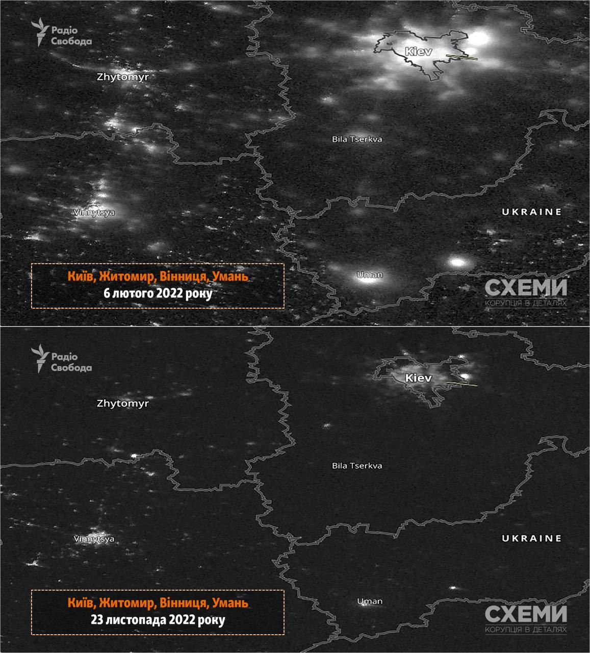 Програма Радіо Свобода "Схеми" опублікувала порівняння супутникових фото українських міст до початку повномасштабного вторгнення РФ і 23 листопада після масованого ракетного обстрілу.