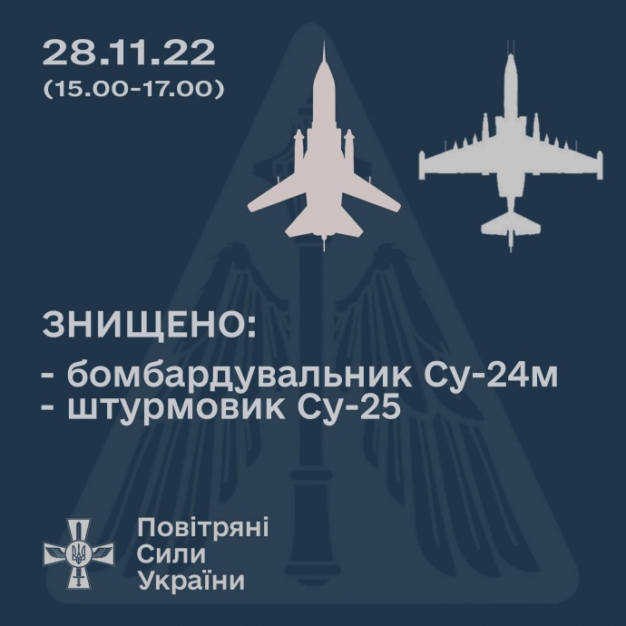 Українські військові збили два російські літаки на Лисичанському та Бахмутському напрямках 28 листопада.
