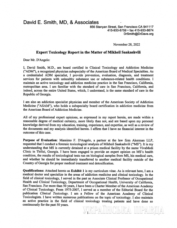 "Мене залучили для надання експертного висновку щодо стану здоров'я Михеїла Саакашвілі, результатів токсикологічних досліджень біологічних зразків, отриманих від нього, надання йому медичної допомоги, а також щодо необхідності його негайного переведення до іншого медичного закладу за межами Грузії для належного лікування та детоксикації", – йдеться у висновку лікаря.