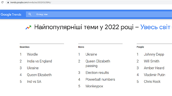 У пошуку новин найпопулярнішим запитом було слово Україна, далі смерть королеви Єлизавети, лотерейні номери та мавпяча віспа.