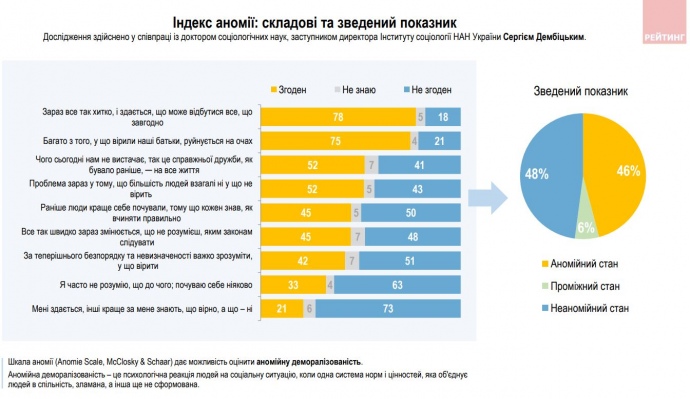 Наразі ключовими причинами існування аномійних настроїв серед українців є "невпевненість у майбутньому та відчуття руйнування того, у що вірили їх батьки".