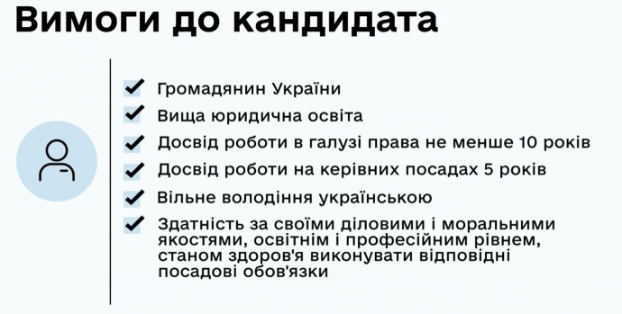 Деталі: Зокрема, серед вимог до кандидата є наявність вищої юридичної освіти, досвід роботи в галузі від 10 років, при цьому - 5 років на керівних посадах.