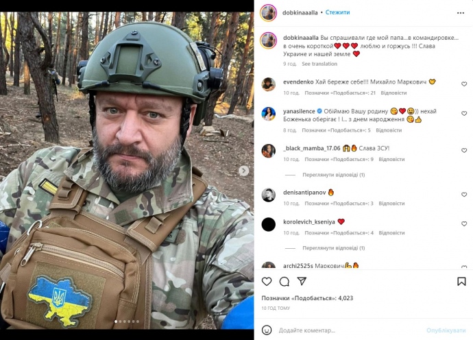 У жовтні донька Добкіна Алла у своєму Instagram опублікувала кілька різних фото ексмера Харкова у військовій формі і підписала їх так: "Ви запитували, де мій тато… У відрядженні, у дуже короткому. Люблю і пишаюся! Слава Україні та нашій землі".