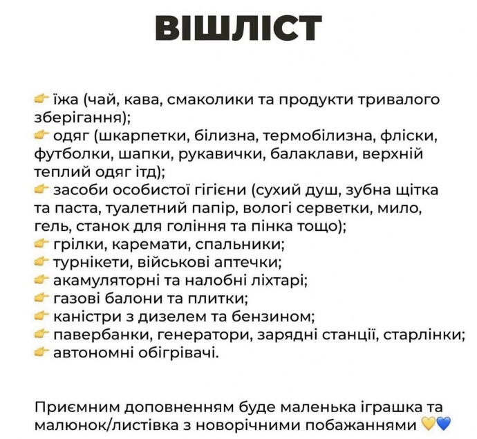 Організатори склали спеціальний "вішліст" (список бажань) для військових. "Навіть один батончик чи пара шкарпеток - важливі", зазначає Вікторія.