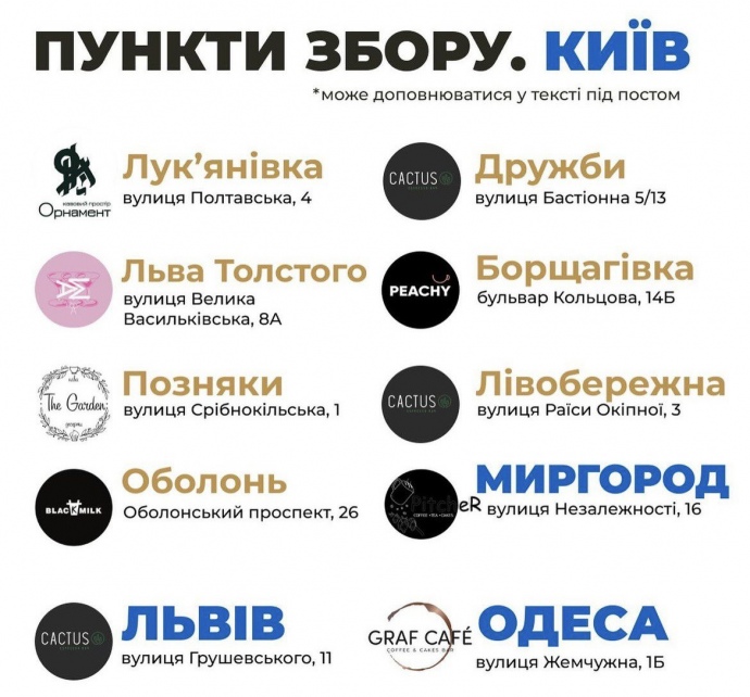 Деталі: За словами однієї з організаторок акції - Вікторії -, загалом таких пунктів збору близько п’ятнадцяти. Вони локалізуються не лише в Києві, але й у Львові, Миргороді та Одесі.