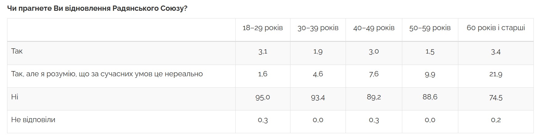 Навіть серед представників найстаршої вікової групи, ті, хто не хотів би відновлення Радянського Союзу, становлять переважну більшість (74,5%), а серед тих, кому менше 30 років, ця частка зростає до 95%.
