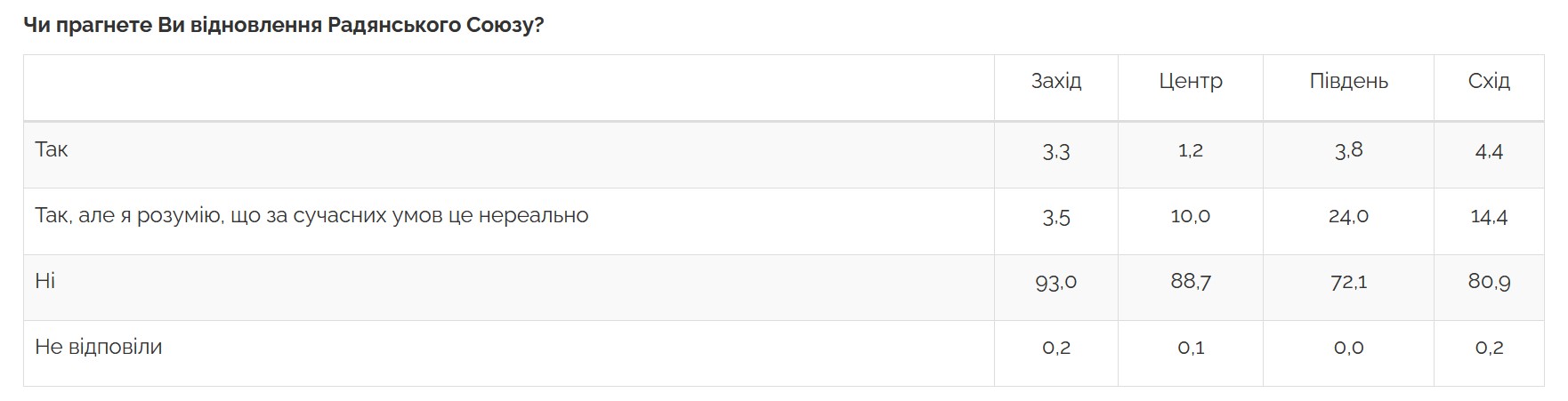 Частка тих, хто не хотів би відновлення СРСР, становить переважну більшість у всіх регіонах Україні, включно зі сходом і півднем.
