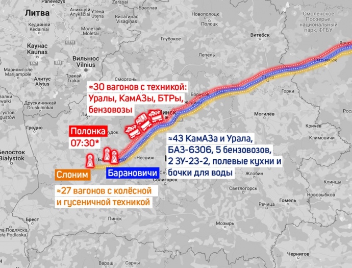 Джерела моніторингової групи стверджують, що о 07:30 на залізничну станцію Полонка у Барановському районі Брестської області прибув ешелон, у якому перебувало близько 30 вагонів-платформ із колісною технікою, 4 криті вагони і 2 пасажирські вагони з особовим складом. Серед техніки помічені: Урали, КамАЗи, БТРи, бензовози.
