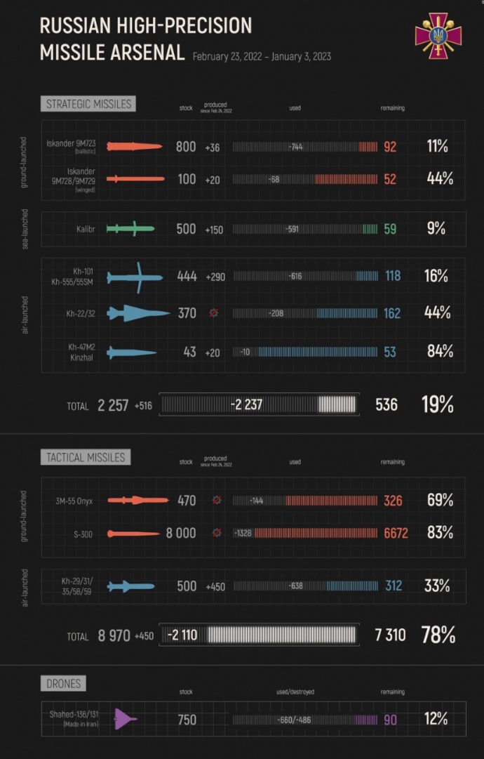 Зокрема, залишилося 9% "Калібрів" та 11% балістичних ракет "Іскандер". Водночас Росія все ще має достатню кількість крилатих "Іскандерів" та С-300.