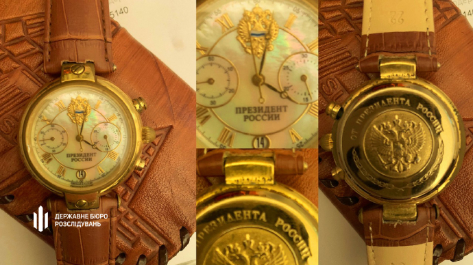 Дослівно: "Показовою знахідкою та черговим доказом для слідства став, начебто, золотий нагородний годинник від президента РФ, яким колаборант вихвалявся в оточенні, стверджуючи, що це справжній подарунок від путіна за теплу зустріч "нової влади".