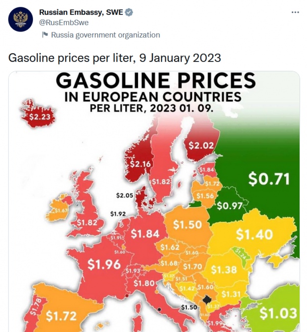 На офіційній сторінці посольства Росії у Швеції у Twitter у вівторок було опубліковано карту, на якій Крим позначений як територія України.