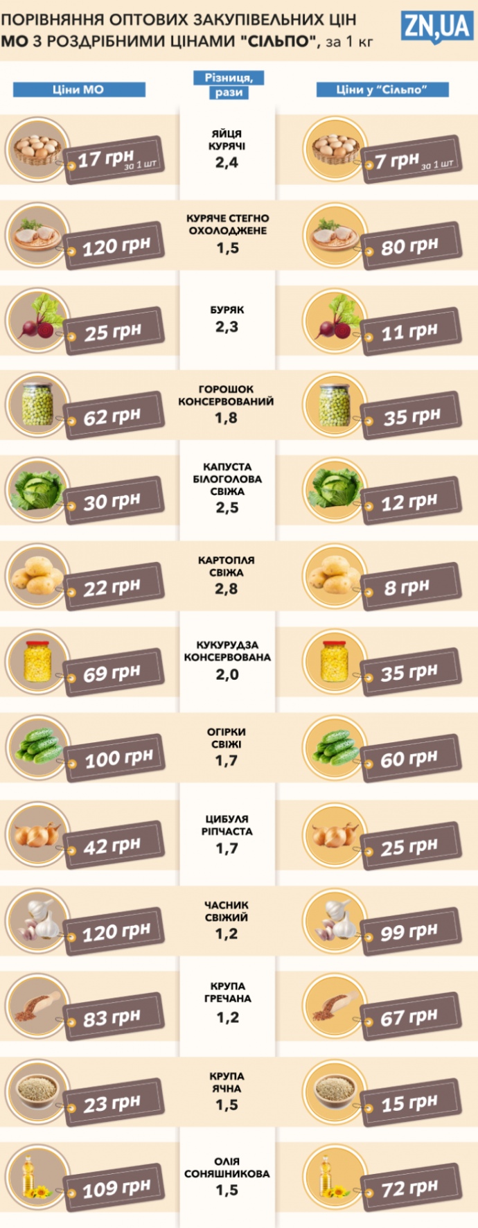 Для порівняння видання обрало мережу магазинів "Сільпо" у спальному районі Києва. Ціни на найбільш ходові харчі виявилися завищеними у 2-3 рази.