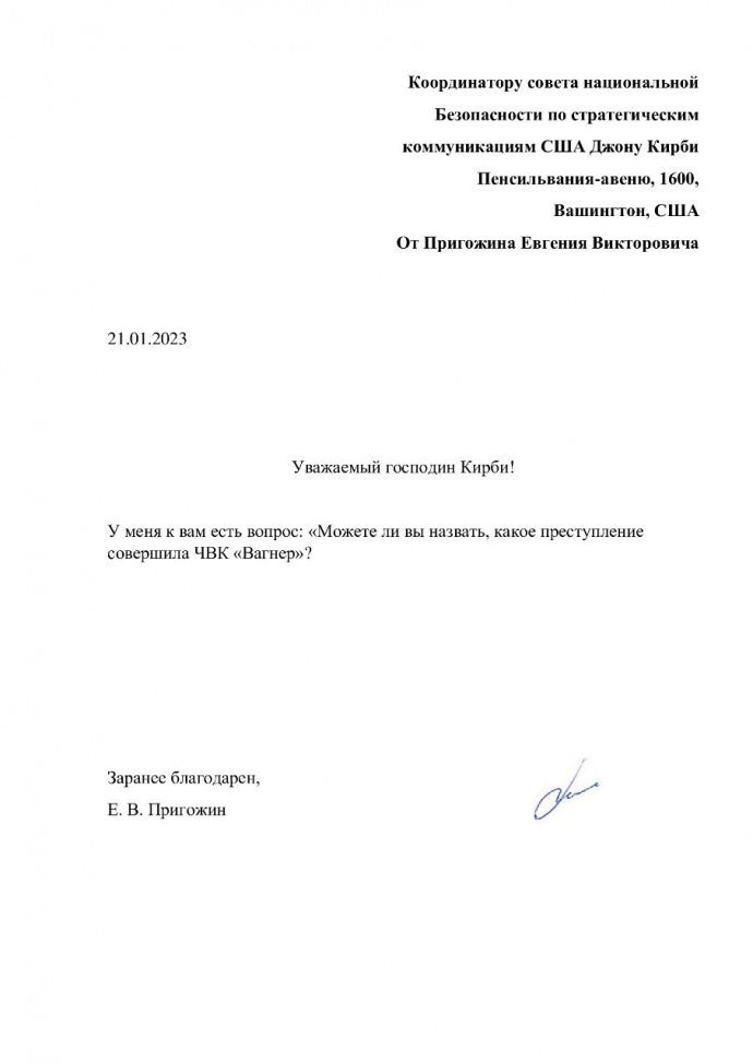 Деталі: У Пригожина опублікували лаконічний лист російською та англійською мовами, адресований координатору Ради національної безпеки США Джону Кірбі.