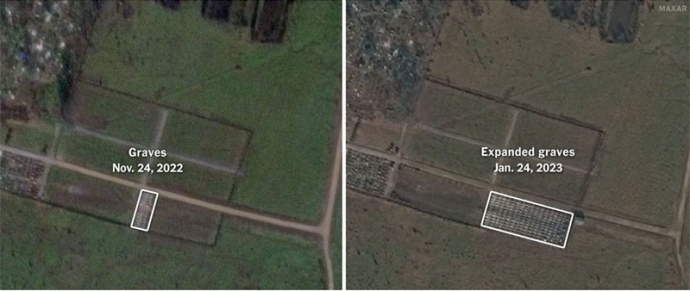 На супутниковому знімку, зробленому 24 січня, видно близько 170 поховань у районі цвинтаря, де ховають бійців "Вагнера", і ця кількість збільшилася майже у 7 разів порівняно з тим, що було видно на супутникових знімках лише два місяці тому".