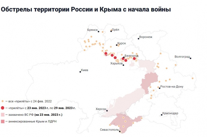 "Новая газета Европа" підрахувала, що від початку збройної агресії прифронтові регіони Росії та анексований Крим зазнали обстрілів зі сторони Збройних сил 350 разів, частота обстрілів зросла у 10 разів.