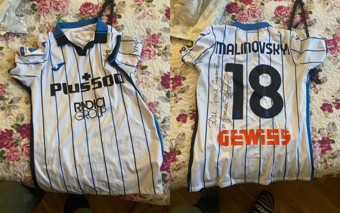 Лот №2 — футболка гравця французького "Марселя" і національної збірної України Руслана Маліновського. (футболка "Аталанти", за яку грав раніше Руслан Малиновський).