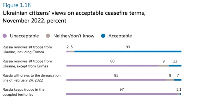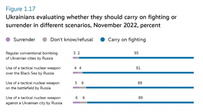 89% українців готові продовжувати чинити опір навіть після застосування Росією тактичної ядерної зброї проти міста, 93% умовою для припинення вогню називають повне виведення військ РФ, у тому числі з окупованого Криму.