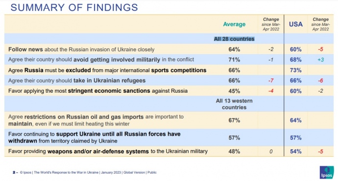Опитування компанії Ipsos, що провела масштабне дослідження в кінці 2022 року, показало, що громадяни більшості західних країн, як і раніше, твердо підтримують Україну.