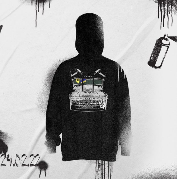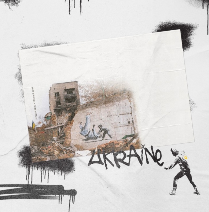 Дослівно: "На поштовому випуску представлено одне з семи графіті всесвітньо відомого вуличного художника та політичного активіста Бенксі, створених ним анонімно в Україні в 2022 році. Графіті з дзюдоїстом, відправленим в нокаут, художник намалював на стіні зруйнованого будинку у смт Бородянка Київської області".