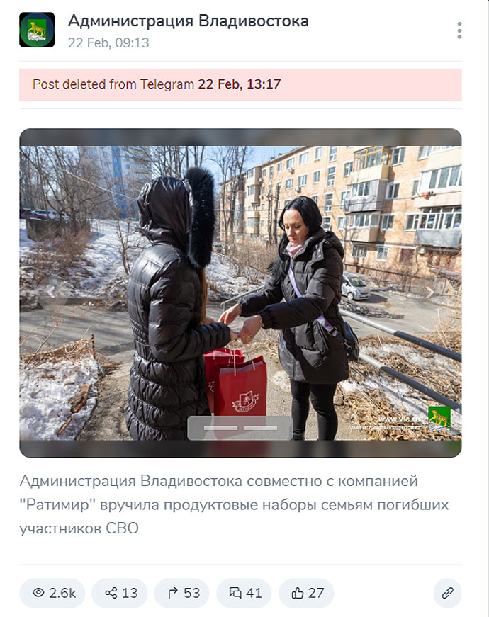 Повідомляється, що родичі загиблих в Україні окупантів отримали від місцевої влади продуктові набори від компанії "Ратимир".