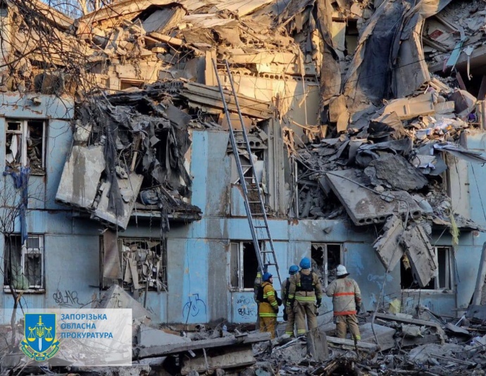 - Раніше повідомлялося, що внаслідок удару росіян по 5-поверховому будинку у Запоріжжі загинули 2 людини, рятувальники дістали з-під завалів 11 осіб, будинок практично повністю зруйновано.