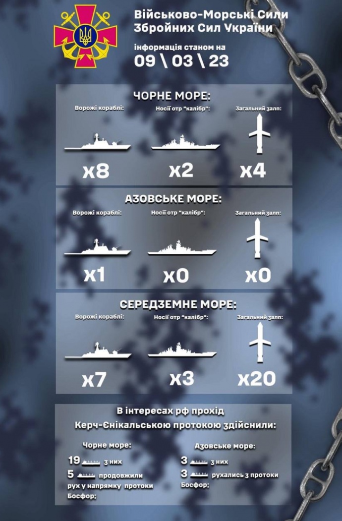 Дослівно ВМС: "В Чорному морі на бойовому чергуванні знаходиться 8 ворожих кораблів, серед яких 2 носії крилатих ракет "Калібр" з загальним залпом до 4 ракет".