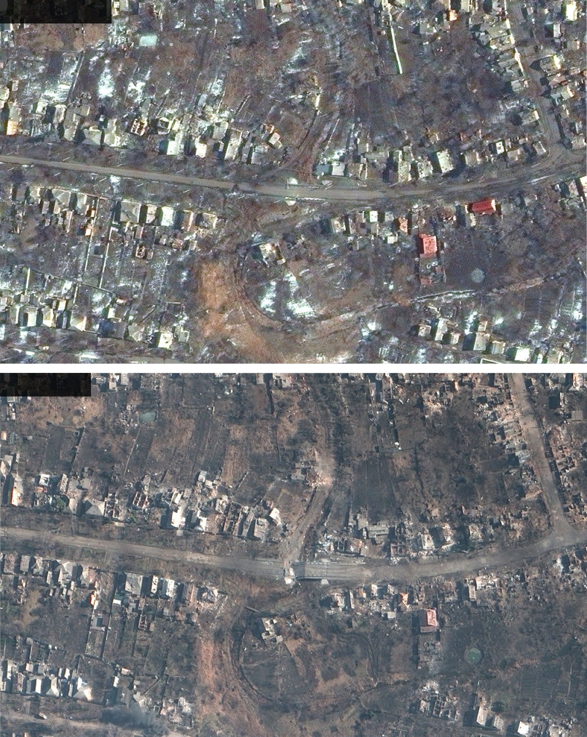 Крім того, інший знімок за 6 березня свідчить, що за останні кілька тижнів були сильно пошкоджені район та міст на півдні Бахмута.