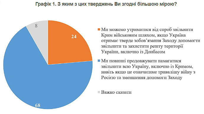 Дослівно соціологи: "Більшість респондентів – 64% – вважають, що Україна має намагатися звільнити всю територію включно з Кримом, навіть якщо буде ризик зменшення підтримки Заходу і ризик тривалішої війни. На противагу цьому 24% більше схиляються до варіанту, що в обмін на визволення та захист усіх територій з Донбасом (але без Криму) Україна може утриматися від військових дій в Криму".
