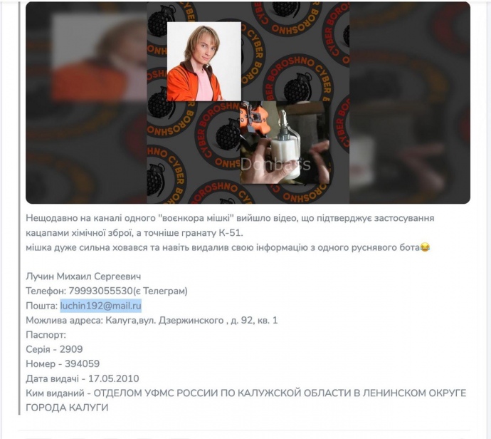 Українські активісти з організації "Кібер Спротив" знайшли дані про росіянина Михаїла Лучіна - "добровольця СВО" (так росіяни називають війну проти України), й оператор БПЛА, який зняв на відео використання армією РФ хімічної зброї.