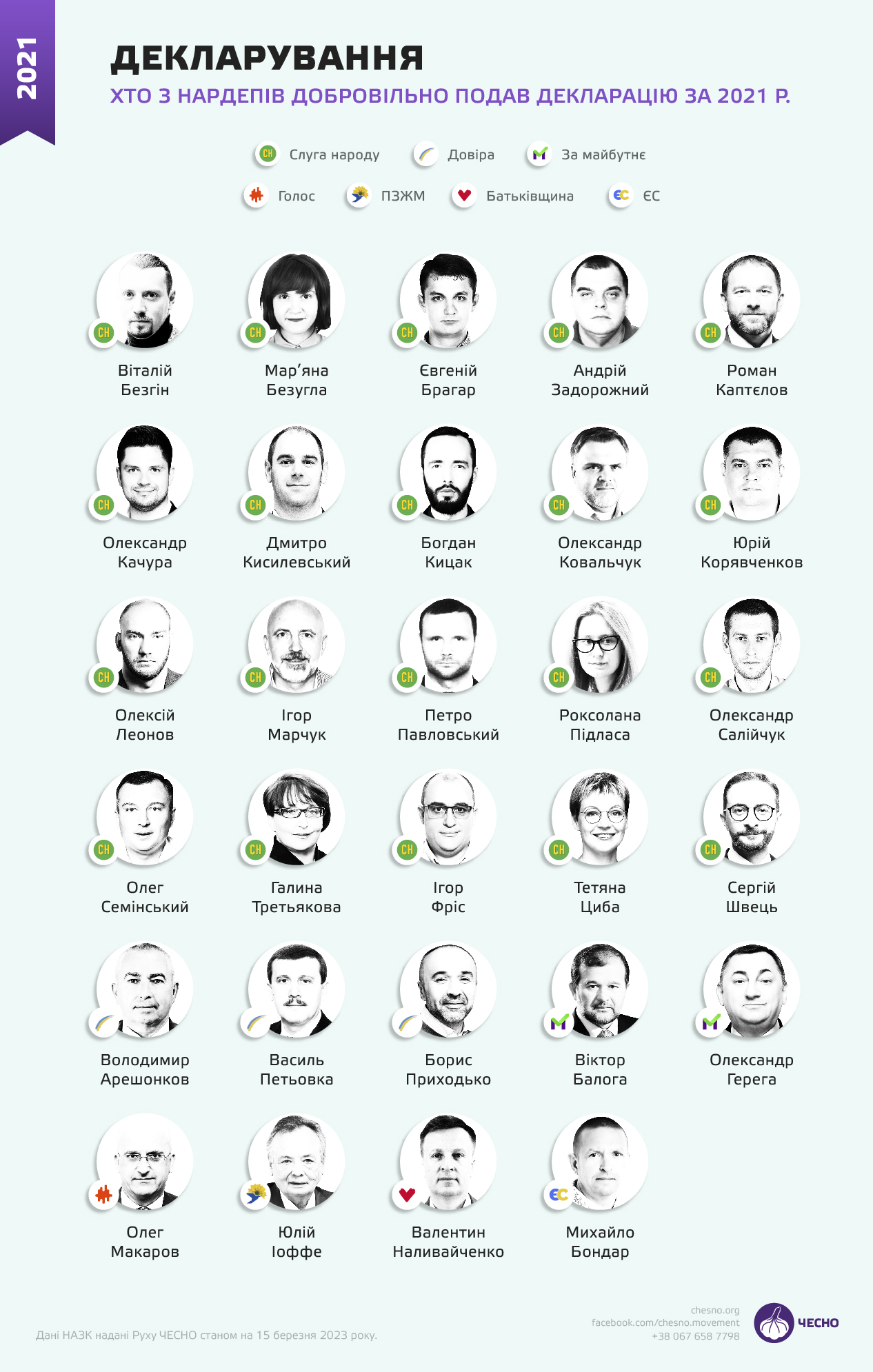 Дослівно Чесно: "Станом на 14 березня лише 29 нардепів Верховної Ради добровільно подали щорічні декларації за 2021 рік. Однак до завершення воєнного стану громадяни і медіа не зможуть ознайомитися з деклараціями, а НАЗК – перевірити їх".