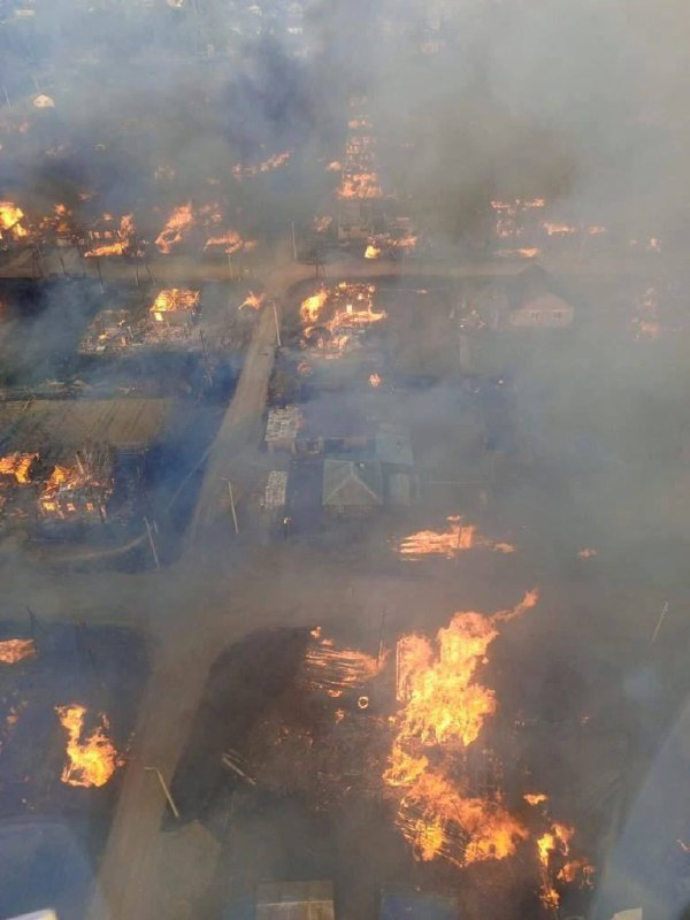 "Пожежа почалася близько 12 дня з пилорами - сильний вітер розніс вогонь на житлові будинки. До 21-ї години за місцевим часом у селищі горіли приблизно 50 будинків, було введено режим НС. Пізніше того ж дня під завалами згорілого будинку знайшли одного загиблого - пенсіонера 62 років", - повідомили в МНС.