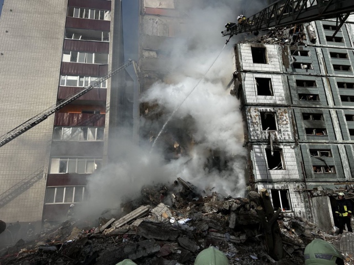 Внаслідок влучання ворожої ракети зруйновано під’їзд дев’ятиповерхівки.
